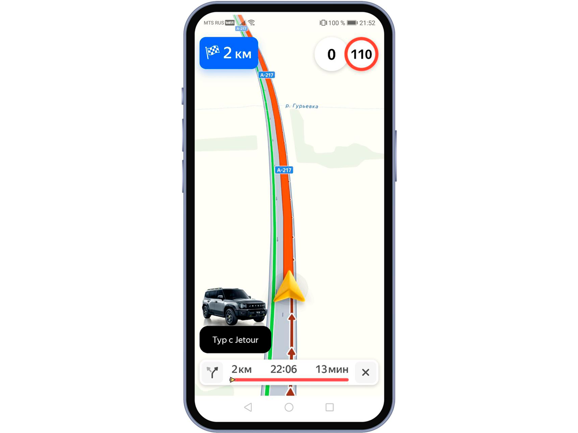 На главном экране Яндекс Навигатора можно увидеть кнопку для перехода на сайт проекта «Тур с Jetour». Здесь опубликованы полезные советы по путешествиям в различных регионах страны. Также пользователи сервиса могут установить в качестве курсора изображение новейшего внедорожника Jetour T2. Помимо этого на веб-версии Яндекс Карт есть промо-кнопка, а в пробке пользователи могут увидеть брендированный баннер Jetour.